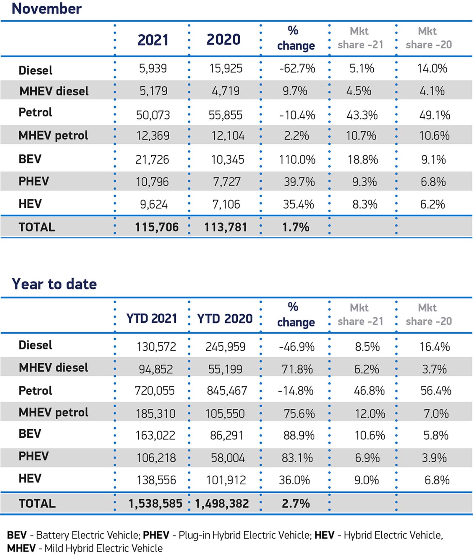 Battery electric vehicles (BEVs) equated to an impressive 18.8 percent of the market, with 21,726 units. This was more than double compared with November 2020.