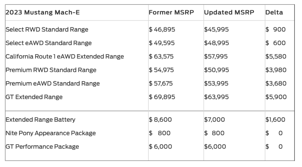 For example, the 2023 Mustang Mach-E Select RWD Standard Range, sees a price drop of $900 from $46,895 to $45,995. Even bigger savings can be had on higher-end models, such as the sporty Mustang Mach-E GT Extended Range, which sees a saving of $5,900 as prices fall from $ 69,895 to $63,995.