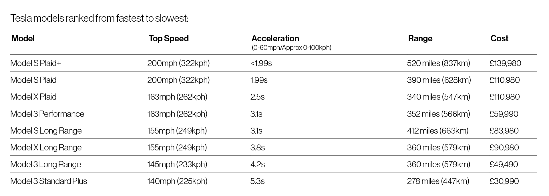There are very few production petrol cars that can do this sort of speed and would certainly cost considerably more. In the world of zero-emissions vehicles there are a few hypercars on the way that have some impressive figures but simply don’t compete with the Model S Plaid+ on all of its class-leading speed, acceleration and range.