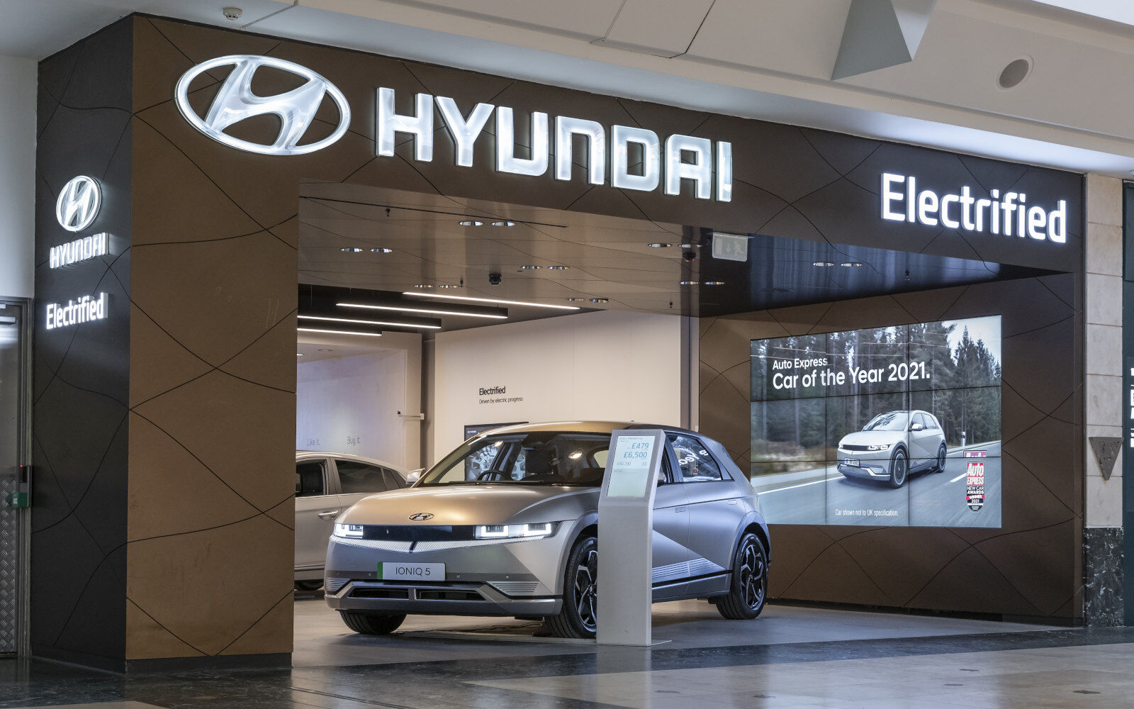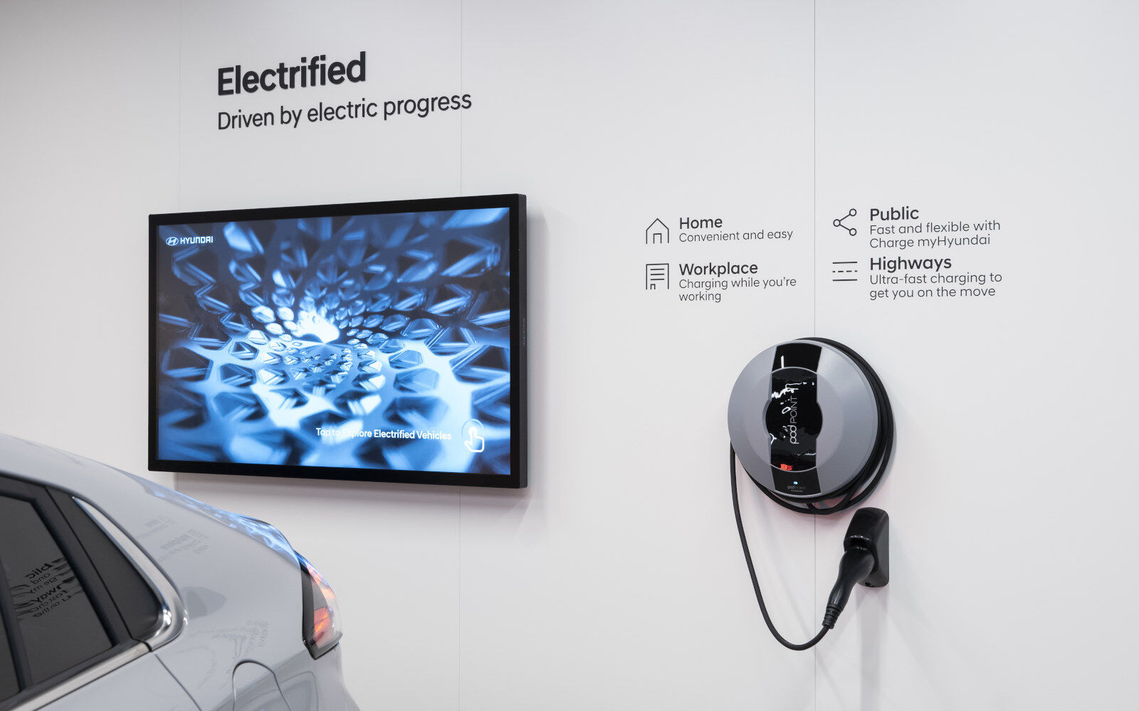 The store’s ‘Electrified Wall’, features a fully functioning home charger unit along with a large touchscreen that provides easy-to-access information and engaging content on each of Hyundai’s fully electric models.