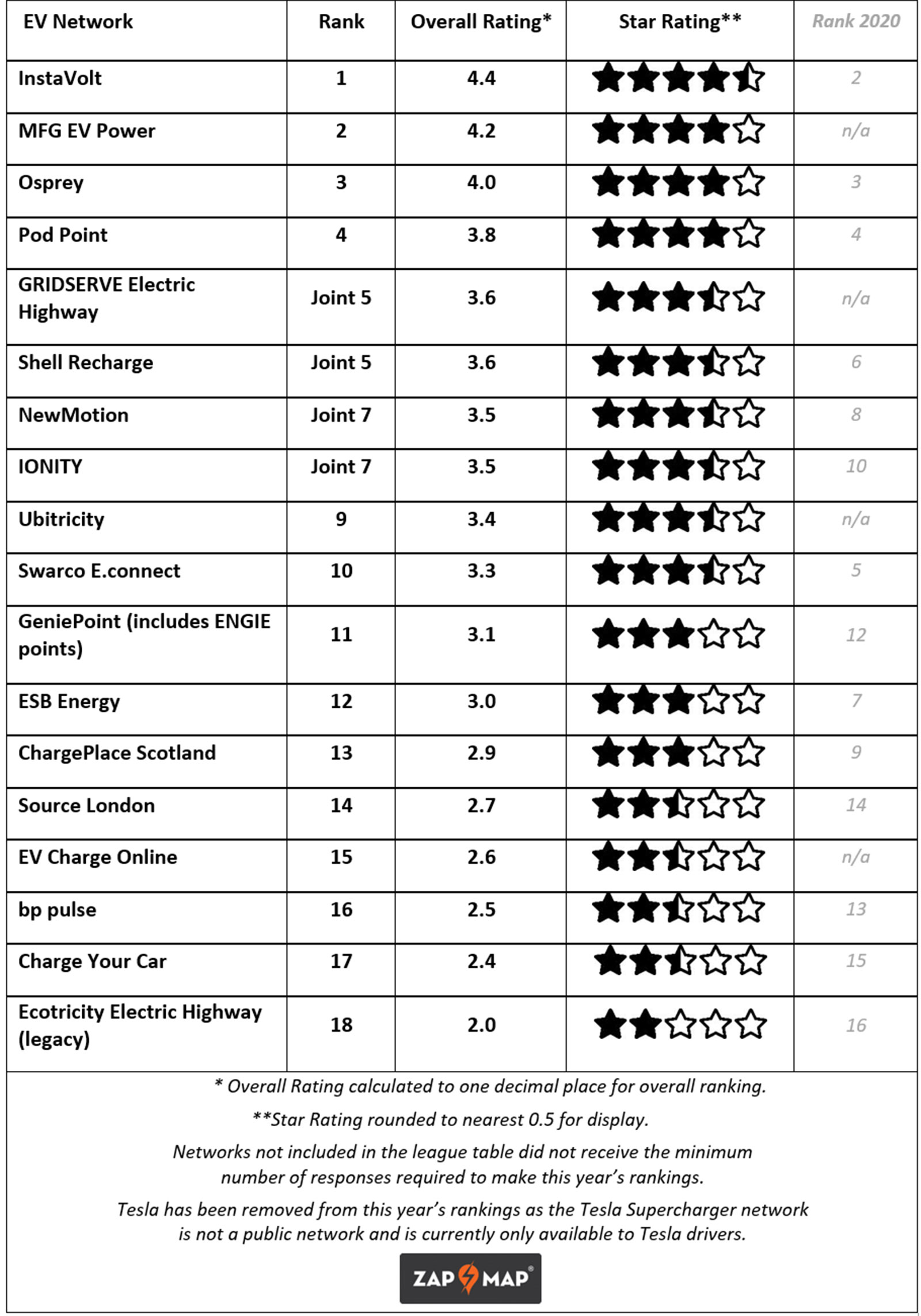 Zap-Map, the UK’s leading electric vehicle (EV) mapping service, has released its annual public charging network satisfaction rankings with InstaVolt topping the charts. The league table, now in its fourth year, comes from Zap-Map’s annual electric vehicle charging survey.
