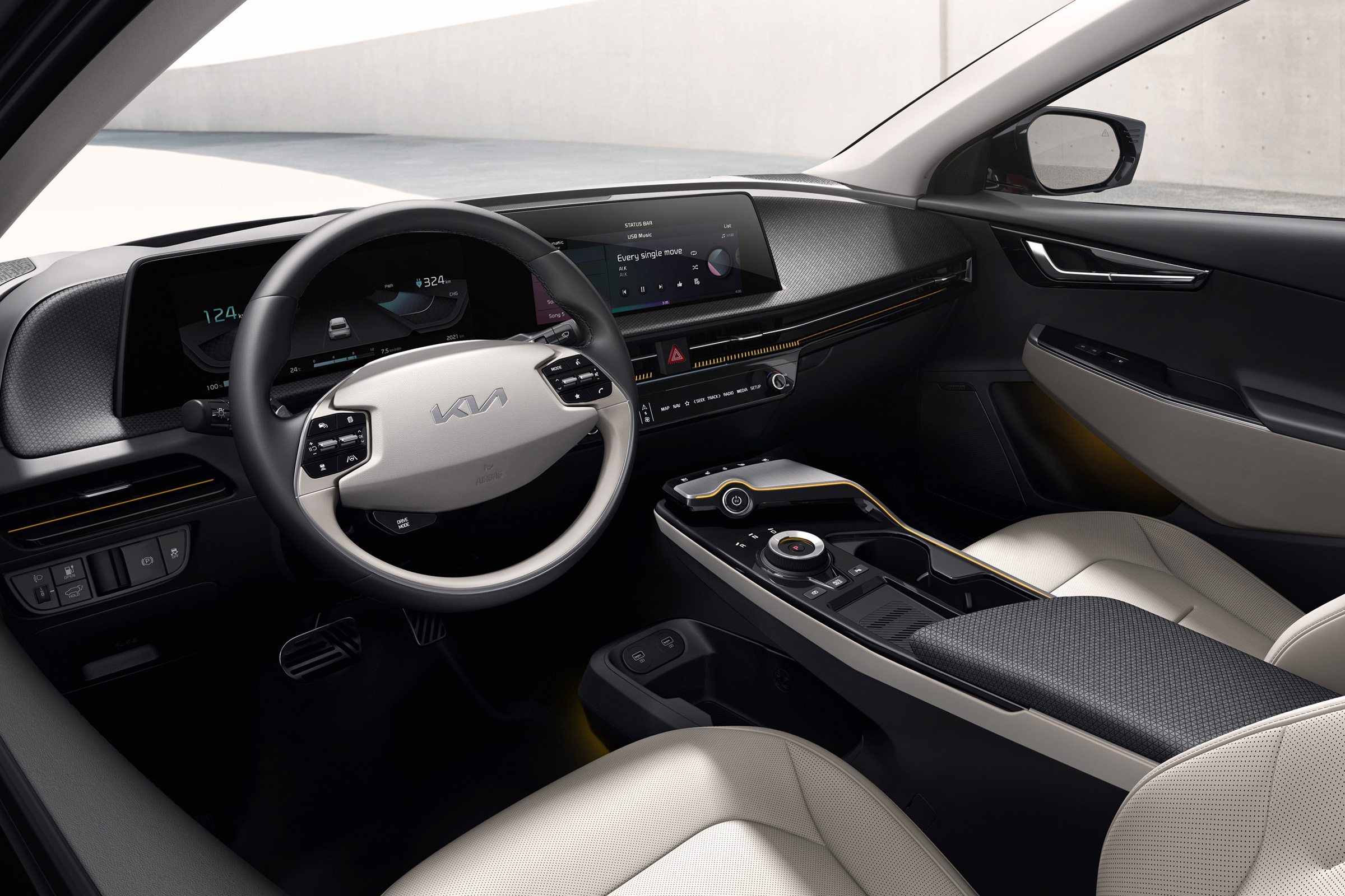 The interior design is modern and spacious thanks to Kia’s dedicated E-GMP platform, which offers increased space. Kia says one of the most striking elements of the new interior is a seamless high-tech curved high-definition audiovisual and navigation (AVN) screen. Its wide curved screen and the slim dashboard give the space an open feel. A minimal number of physical buttons offer an uncluttered and easy driver-friendly experience.