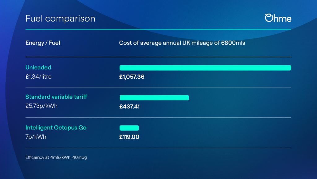 Whilst charging on the standard variable tariff rate is already significantly cheaper than the costs of running a petrol or diesel car, Ohme‘s own research shows that one of its own smart chargers, combined with a dynamic energy tariff such as the Intelligent Octopus Go tariff from Octopus Energy, could unlock even further savings.