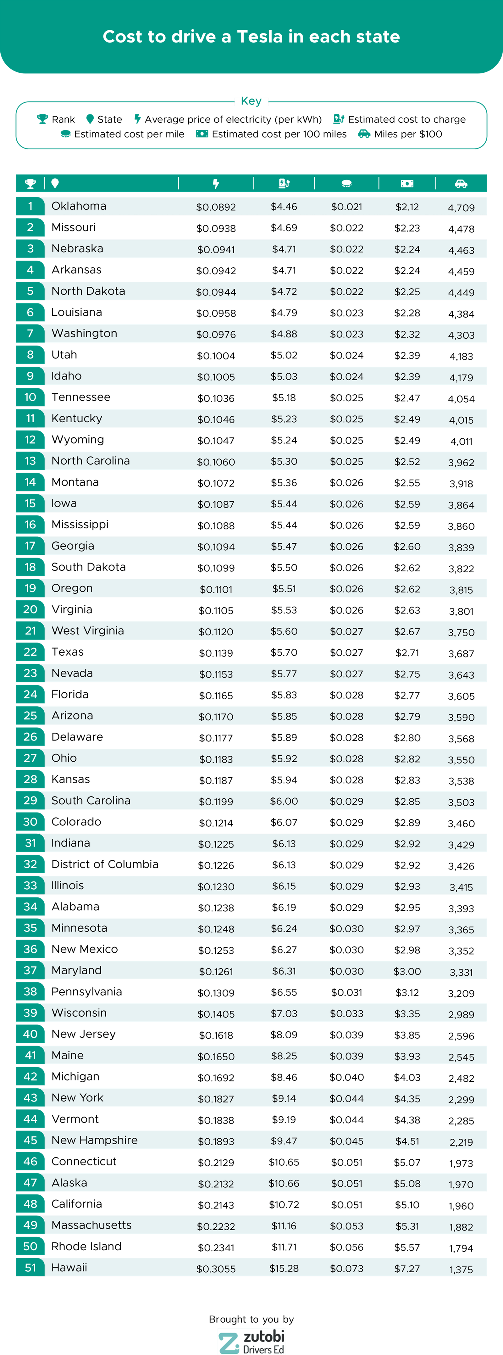 For the survey, Zutobi used the Tesla Model 3 Standard Range Plus, which they found to be the best value electric car to charge in the USA. This was then used to see which states were the cheapest and most expensive to run this electric vehicle (EV). They found the state that offered the best value was Oklahoma.